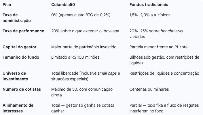 O Columbia50 foi criado para seguir a mesma filosofia das grandes casas de investimento em valor, mas com uma estrutura mais simples, enxuta e totalmente alinhada ao investidor.