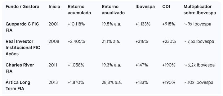 Desde os anos 2000, gestoras independentes brasileiras que seguem a escola de valor — como Guepardo, Real Investor, Charles River e Ártica — entregaram retornos muito superiores aos índices de mercado, superando amplamente o Ibovespa e o CDI em praticamente todos os períodos de 5 e 10 anos.