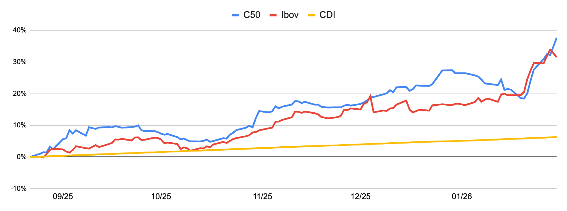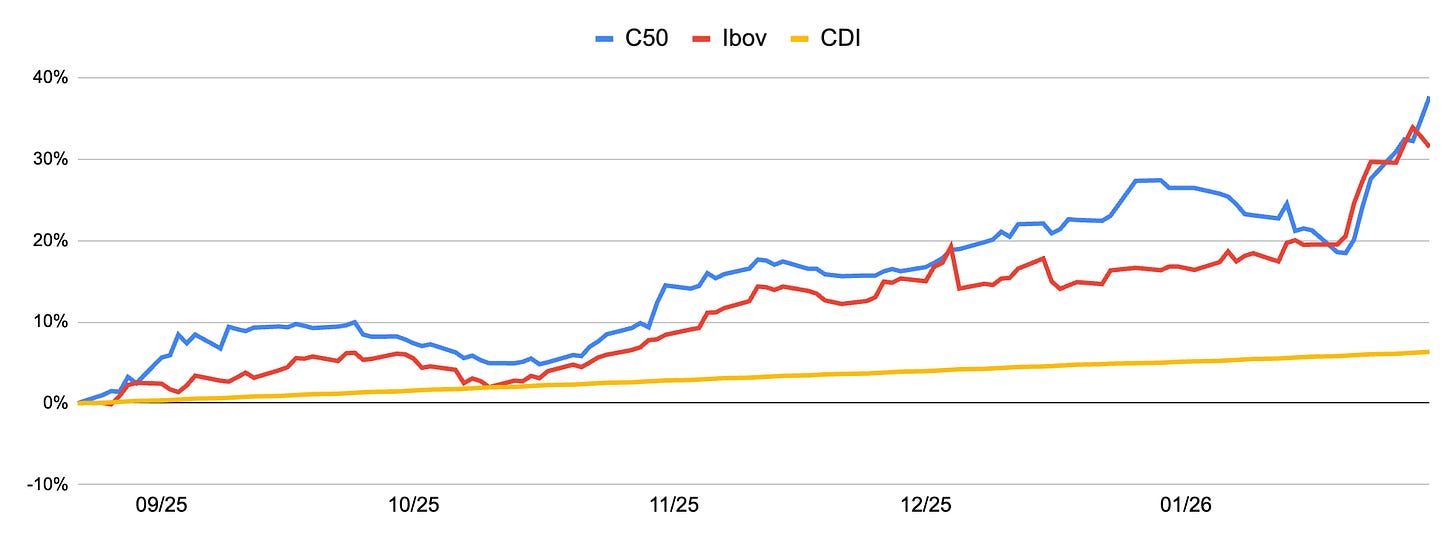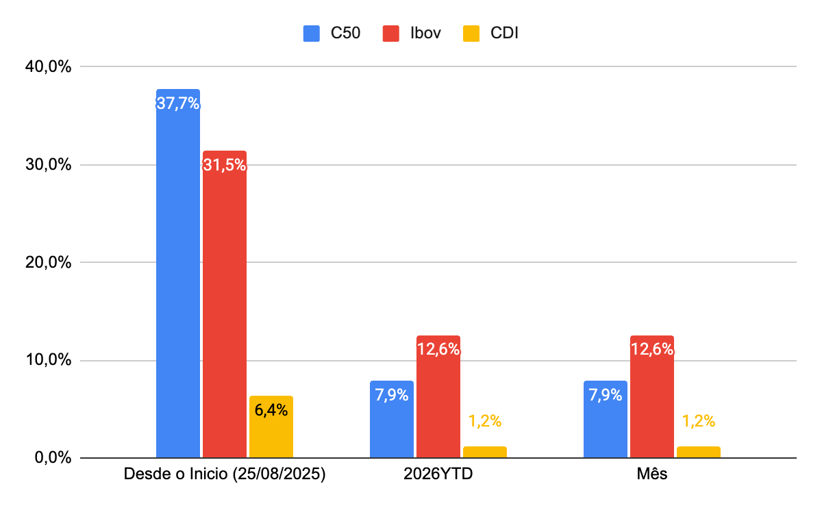 Em Janeiro, o Columbia50 registrou um retorno de 7,9%, ficando abaixo do Ibovespa, que teve uma valorização de 12,6% no mês. No entanto, desde o seu lançamento (22 de agosto de 2025), o fundo demonstrou um desempenho superior, acumulando 37,7% de rentabilidade, em comparação com 31,5% do Ibov e 6,4% do CDI.