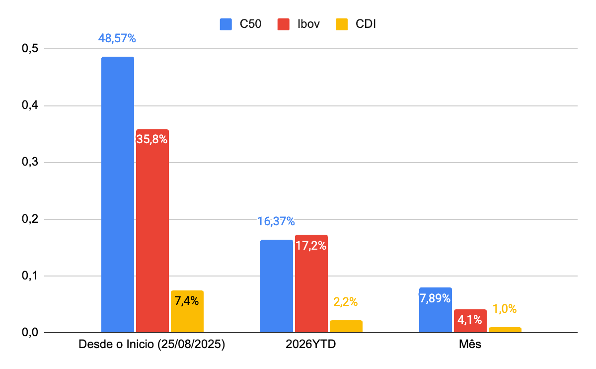 Em Fevereiro, o Columbia50 registrou um retorno de 7,9%, acima do Ibovespa, que teve uma valorização de 4,1% no mês. Desde o seu lançamento (22 de agosto de 2025), o fundo acumula 48,6% de rentabilidade, em comparação com 35,8% do Ibov e 7,4% do CDI.
